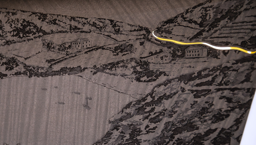 The design motifs, which include maps, landscapes, flowers and trees, are etched onto the wood at three different depths using a laser, each line of light and shadow carrying echoes of Phantom’s century of stories. Areas more deeply-etched into the wood appear to be darker, providing a contrast to the more reflective surface of the unetched veneer. This produces subtle shifts in colour and light, adding a sense of movement and texture beyond the linework.